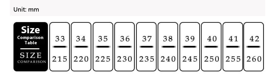 Size: 33, 34, 35, 36, 37, 38, 39, 40, 41, 42