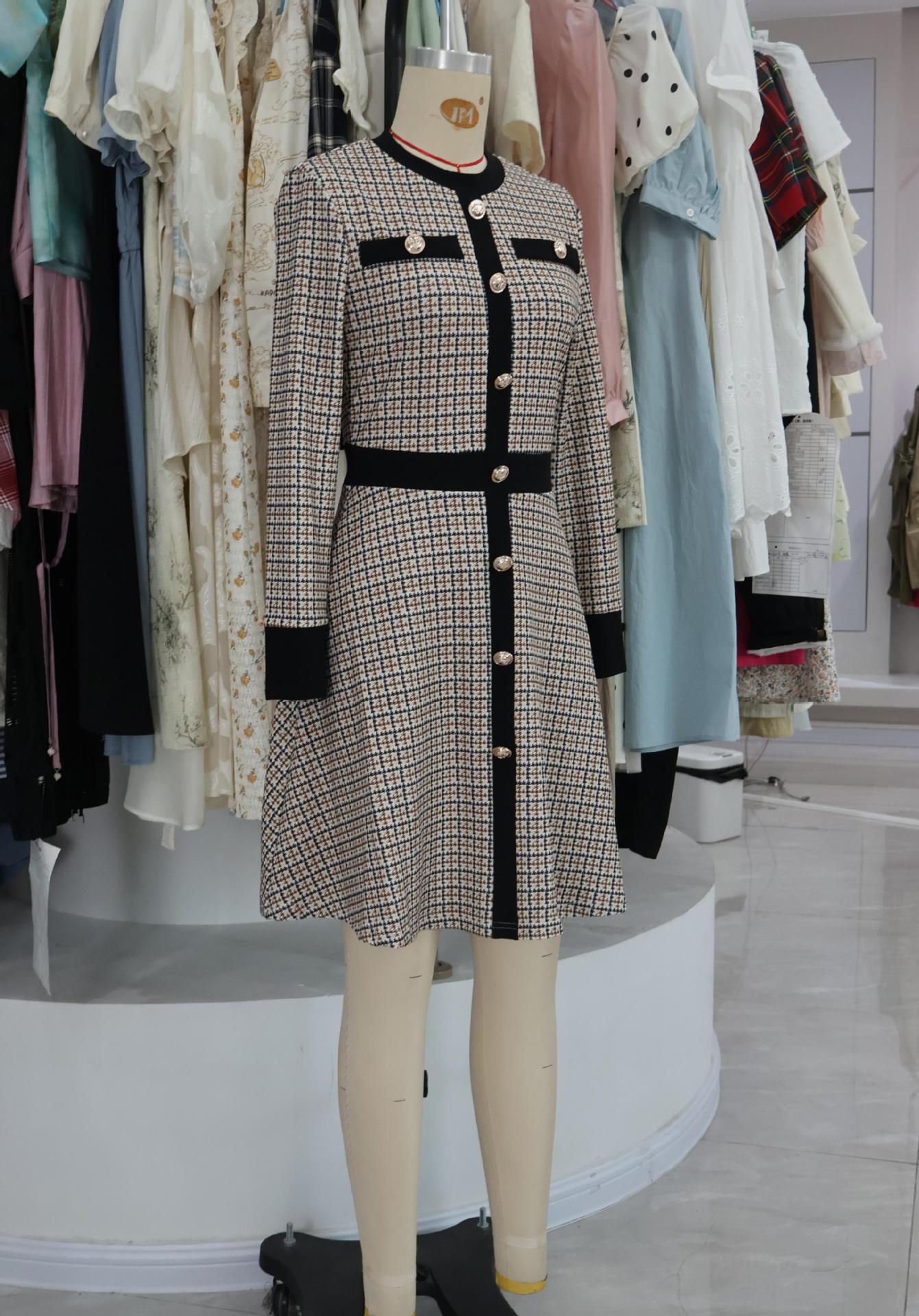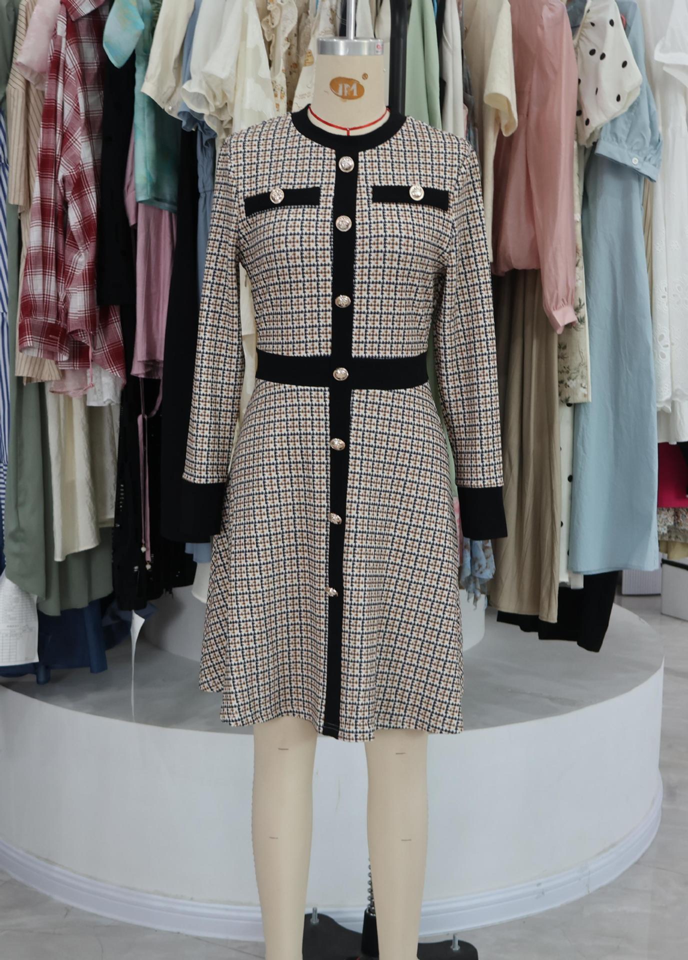 Knitted Houndstooth Button-up Long Sleeve Dress