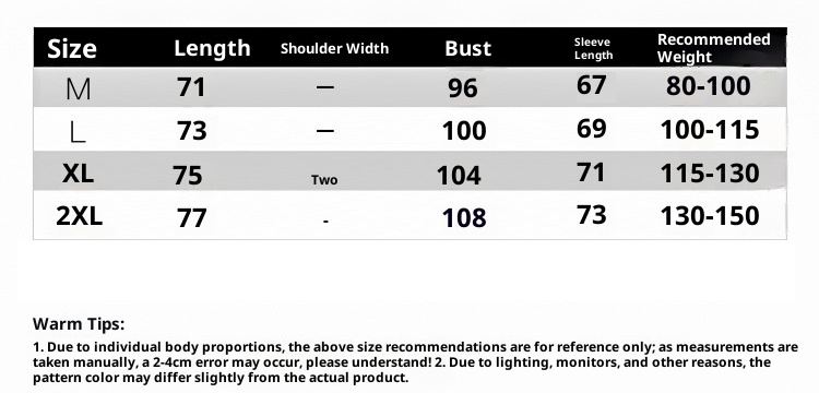1. Asian sizes are 1 to 2 sizes smaller than European and American people. Choose the larger size if your size between two sizes. Please allow 2-3cm differences due to manual measurement. 2. Please check the size chart carefully before you buy the item, if you don't know how to choose size, please contact our customer service. 3.As you know, the different computers display colors differently, the color of the actual item may vary slightly from the following images.